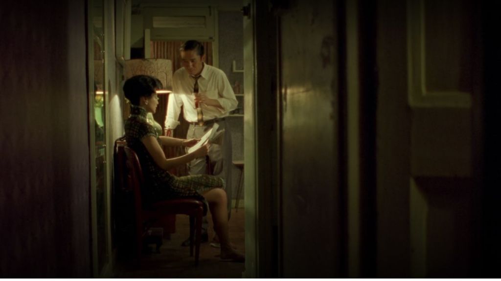 Al lento y elegante compás de 3/4, la relación se va estrechando. El tiempo pasa, lo notamos por los frecuentes cambios de qipao de Su Lizhen, un vestido tradicional elegante y encorsetado, con un cuello alto y rígido que apunta a la rectitud moral del personaje. En una cena en un restaurante, desvelan que saben que sus parejas están teniendo una relación. A partir de ese momento inician un juego de rol en el que se ponen en la piel de sus parejas, o simulan escenas en las que se enfrentan a ellos, queriendo saber la verdad. Chow convence a Su para que le ayude con la escritura de su novela de artes marciales y se citan en la habitación de un hotel. El amor surge —lo vemos aparecer en esos planos fragmentados, en la cara de él antes, después en la de ella—, pero las convenciones sociales y sus propias barreras morales lastran la relación. Se agradece que Wong Kar-wai deje la historia de lo que pasó entre ellos bastante abierta, de manera que cada espectador puede completar la narrativa y recordar una película diferente.